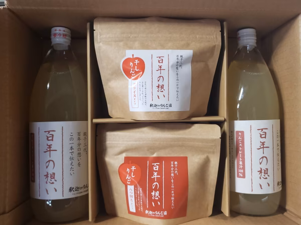当園自慢の三品種ブレンドジュースと、乾燥リンゴチップスタイプと肉厚八切りタイプのセットになります🍎