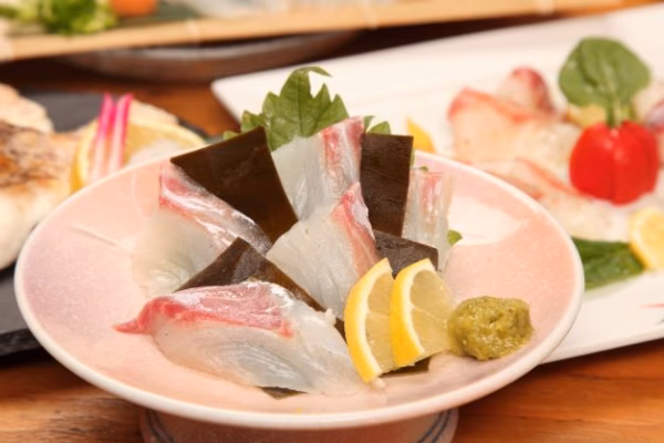 駿河湾で水揚げした新鮮なマダイを昆布で締めて熟成させました。