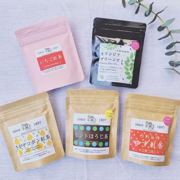 「ミントほうじ茶」×2、「いちご紅茶」×1、「さがデコポン紅茶」×1、「オリンピアグリーンティー」×1、「ゆず紅茶」 の6袋がセットになっています。