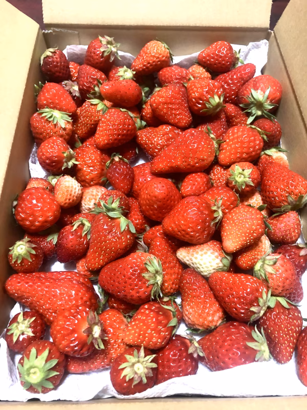 小粒紅ほっぺを新聞紙とキッチンペーパーをクッション材にした段ボール箱に直接収穫します(収穫当日に発送します)採り忘れの大粒紅ほっぺが入ることもあります