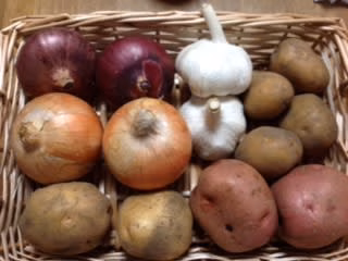 学校給食用に農薬、除草剤、肥料も使わないで育てた、安全で栄養豊富な根菜類。ジャガイモ3種、キタアカリ、アンデスレッド、インカのめざめ。玉ねぎ2種、黄色玉ねぎアトン、赤色玉ねぎ湘南レッド。及びニンニク。