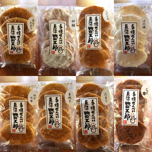 生地は自社生産の魚沼産コシヒカリ「惣五郎」100%!口いっぱいに広がるお米の旨味と、サクッと軽い食感が自慢。一枚一枚「うんまくなれよ~」と心を込めて焼き上げた、米どころ《魚沼》ならではのせんべいです。