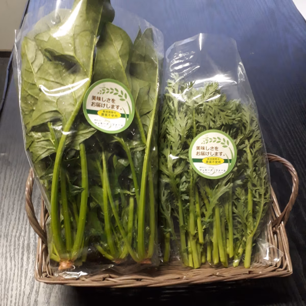農薬を使わず、牧場から仕入れた堆肥でじっくり育て上げた濃い味ホウレン草と香りの強い春菊のセットです。