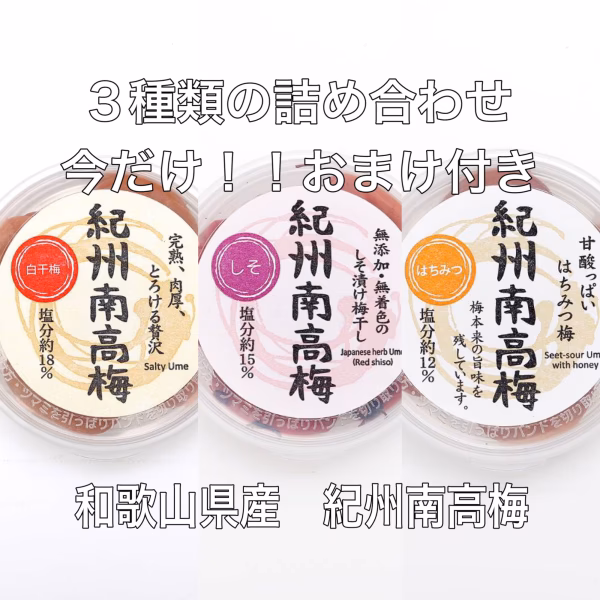 紀州南高梅 白干梅4粒入、しそ漬梅4粒入、はちみつ梅4粒入(各1個)の×2セットの詰め合わせです。
