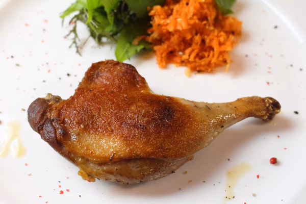 メス鴨のモモを骨付きのまま庄内鴨の脂でじっくりとコンフィした、メインにもなる一品。
