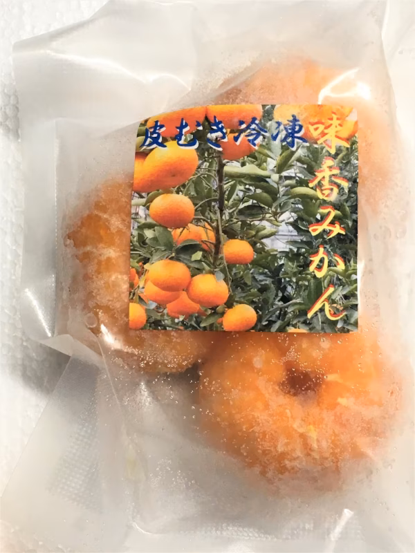 - “味香みかん”を原料として、添加物無しで加工した食品になります。今回は冷凍モノという事で、皮丸ごと果汁・吟醸果汁・皮むき-味香みかんの3種を2個・2個・1個の5個セットにしております。