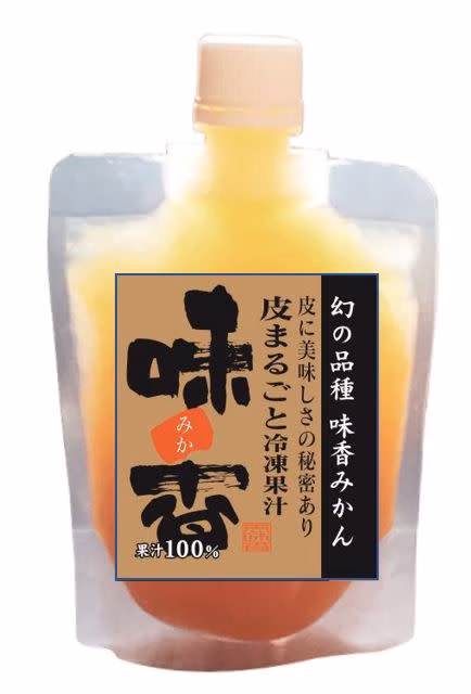 ②皮丸ごと冷凍果汁は、 “味香みかん” 1個を皮も丸ごと果汁にしました。他のミカンでは出来ないモノです。皮ごと食べられる “味香みかん” だからこそ作ることが可能でした。皮を丸ごと絞って苦いだけで本当に飲めるのか?は、大方の疑問点です。しかし、いくつかの会場でご試飲いただいた結果、何と女性の全員の方々から絶賛の声を頂きました。そして感想をお聞きしますと、濃厚な味!という事だけはハッキリしているのですが、他に何と表現してよいか? 適切な言葉が見つからない! という戸惑いをお見せになられるのです。それほどに新境地の未知で不思議な味覚であるという事です。皮食を推奨する “味香みかん” の真骨頂が発揮出来た新しい飲料商品です。