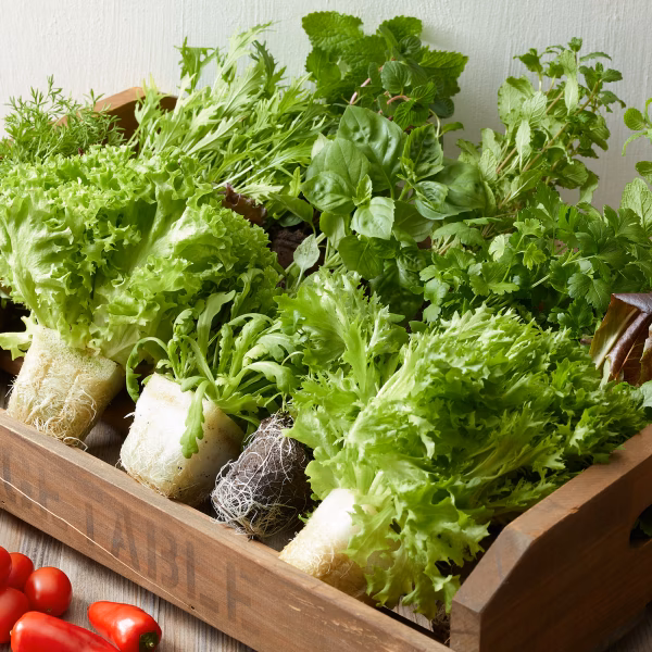 鮮度を保つ為、水耕栽培培地を付けたまま根が付いた状態で家庭へお届けしております。