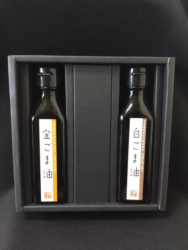 - 画像では白ごま油が入っていますが、ごま油が完売してしまったためごま油2本の組合せの中に白ごま油はお選びいただけませんのでご了承ください。