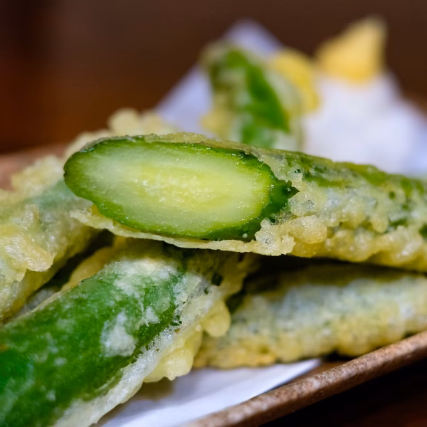 一般的な天ぷらと同じ要領で揚げてください。切らずにそのまま丸揚げがおすすめです。揚げたてにお好みで塩などをまぶしてお召し上がりください。