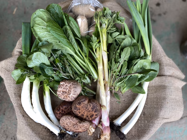 アクの少ないサラダほうれん草、原本で天然に近いしいたけ、虫食いもありますがシャキシャキの小松菜、半年間寝かせて甘くなったじゃがいも、市場にあまり出回らない西洋ネギのポロネギなどが入っています。