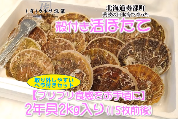 ホタテは日本海の荒波で2年間養殖したもので、大きさは8cm以上です。刺身はもちろん、焼いても煮ても酒蒸しやフライにしても絶品です。殻から外して冷凍しておけばお好きなタイミングでいろいろな料理をお楽しみいただけます。