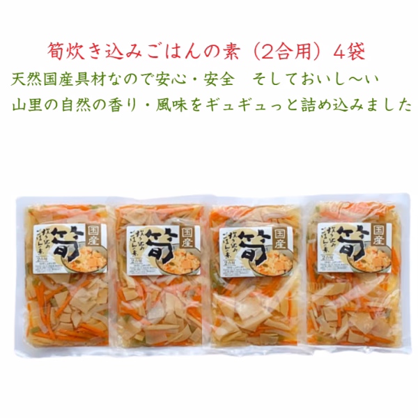 - <たけのこごはんの素> 孟宗竹・こんにゃく・人参・ごぼう・みず・醤油・食塩・アミノ酸・発酵調味液・クエン酸(一部に大豆・小麦を含む)