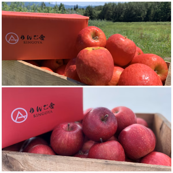 蔵出しサンふじ と 蔵出し奥州ロマン を組み合わせたHALF&HALFです。蔵出しリンゴは春先出荷用に摂氏0度前後・湿度90%以上の環境で冷蔵保存し続けたリンゴになります。リンゴは低温で貯蔵され続けると徐々に蜜(ソルビトール:sorbitol 通常の砂糖より半分程度の甘味)などがブドウ糖やショ糖などの糖分へ変換され、収穫直後とはまた違う美味しさになります。