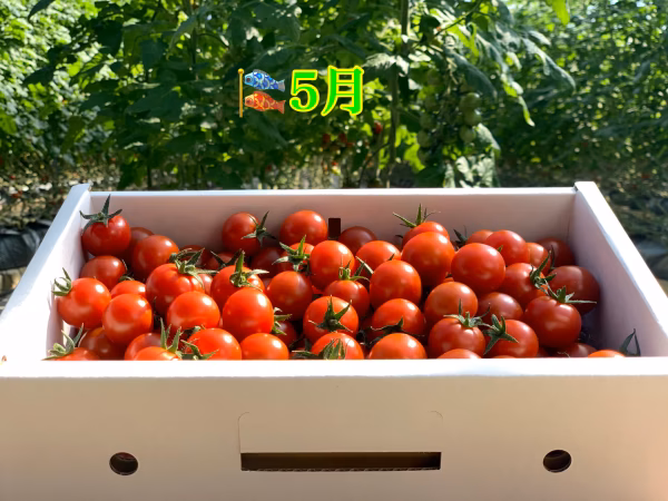 収穫シーズン始まりの12月から早くも半年が経ちました。最低気温が10℃を上回る日も増えました。実は柔らかめの食感だと思います。日のさす時間も日に日に長くなり収穫する私たちも収穫のし甲斐があり楽しんで収穫しています。以前は座って収穫していましたが、立って収穫することも増えました。収穫のし甲斐ありです。まだまだ朝晩は冷える日もあり油断できませんが大切に育てています。時間をかけて赤くなるトマトだけを摘みますので味の濃いトマトになっています。