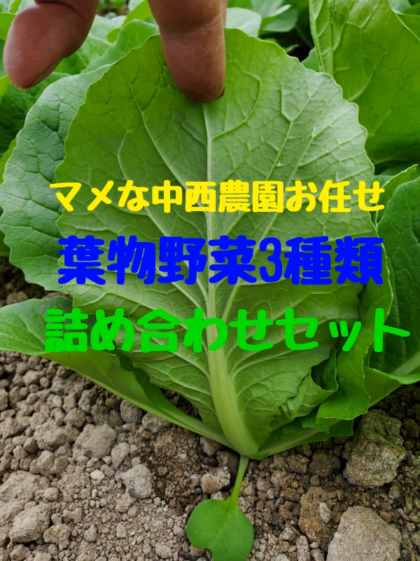 ▼自己紹介 京都府北部、空気と水の美味しい中山間地域で、農業を営んでおります。マメな中西農園です。 ▼商品概要 新型コロナの影響で外食産業への納品がストップして困っております 。 当農園で作っている葉物野菜をおまかせで3種類詰め合わせたセット内容となっています。季節によって中身が変わります。 小松菜、千宝菜、わさび菜、ミニ白菜、春菊、カリーノケール、ほうれん草、万願寺とうがらし【夏限定】、きゅうり【夏限定】の中から3種類から6種類をチョイスして発送いたします。 ▼品種・味の特徴・食べ方 シャキシャキ歯ごたえ。 サラダ感覚で浅漬けやキムチがおすすめの食べ方です。 ▼数量、分量の目安 バラ売りなどの販売も承ります。 ▼栽培/生産方法、こだわり 農薬を極力使わない、安心安全な野菜作りを目指しております。 土作りにこだわりを持っており、海の海藻を使った肥料を使用しております。 ▼注文に際しての注意点(配送方法や納期指定など)