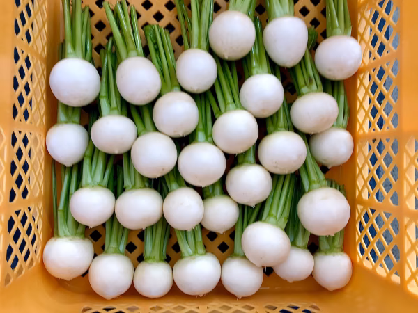 ご好評を頂いているイタリア原産のサラダ小カブ「サラダ・ラティーナ」のB級品を格安でお分け致します。形が歪だったり、成長しすぎて割れが入ったり、表面にシミがついていますが、お味は柔らかくジューシーで生でも美味しくお召し上がり頂けます。茎を少しだけ残し「サイズ60」の宅配ボックスに2kgギッシリお詰めしてお届け致します。
