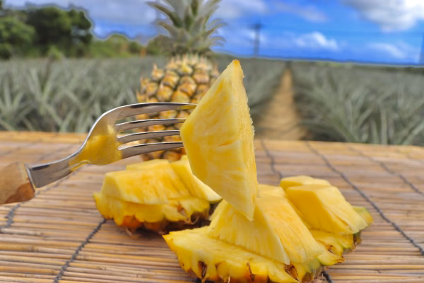 果肉の色は濃い黄色で、通常のパイナップルに比べ酸味が少なく、糖度が高いのも特徴で、とても甘く感じられます。