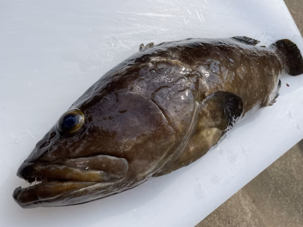 今朝の素潜り漁で海に潜り銛で一発で仕留めたクエです。