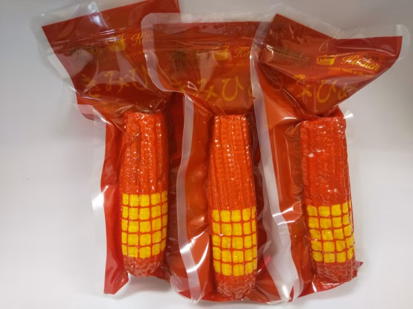 『きみひめ』をレトルト殺菌し、茹でたての味を楽しめるよう、丸ごと一本の真空パックにいたしました。