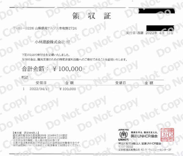 時間がかかりましたが、領収証が届きましたのでトップ写真にUPしました。