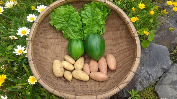 青パパイヤと紅白新ジャガでフレッシュサラダにサンチュを添えてどうぞ! 【セット内容】 青パパイヤ 1キロ(1~3玉)。 新ジャガイモ・はるか 500g。 新ジャガイモ・シェリー 500g。 サンチュ 1束。 (すべて栽培期間中農薬不使用です) 【栽培のこだわり】 当農園の青パパイヤは農薬・化学肥料を使用していません。代わりにカニ殻粉末・海藻粉末など海産ミネラル資材を与え、滋味豊かに育てています。 また牛糞など家畜由来堆肥を一切使用せず、代わりに緑肥を栽培しこれを鋤き込むことで土壌環境の健全化を図っています。 さらに山野の落葉・茅など地域資源を有効活用し、自然生態系を畑に再現しています。 【商品説明】 青パパイヤはパパイヤの未熟果で、果物ではなく野菜として食べられます。 パパイヤは亜熱帯性の多年生草木で冬の寒さに弱く本州では越冬しませんが、近年本州でも一年草として青パパイヤの露地栽培が行われるようになりました。 伊豆諸島三宅島でもパパイヤは露地で越冬しませんが、無加温ハウスで越冬します。当農園の青パパイヤはハウス栽培なので、盛夏期を除き一年中収穫できます。 また当農園では化学合成農薬・化学肥料を使わずに、パパイヤを栽培しています。そのためパパイヤ独特のえぐみが弱く、癖のない味わいです。苦みが弱く、淡泊な味わいなので、パパイヤ臭が苦手な方にも、青パパイヤ初めての方にも、食べやすいと思います。 青パパイヤはフルーツではなく野菜です。半分に切って中の種を取り除いたら、皮を剥いでお好みの大きさにカットし、水にさらしてあくを抜いてください。 千切りにしてトマトなどと合わせてサラダに、あるいは炒めたり、楽しみ方は色々です。 最後の写真は、地元のレストランで当農園の青パパイヤを使って作ったソムタム(タイ風青パパイヤのサラダ)です。 新ジャガイモのはるか(写真3枚目)は果肉は白く、芽がほんのりとピンク色に色づいています。 その最大の特徴は、でんぷん量が少なく生で食べられることです。千切りあるいはスライスしてシャキシャキとした食感を楽しめます。下処理は皮と芽を多めに除きスライスした後十分水にさらします。えぐみを感じたら熱湯をかける、あるいは軽く熱湯に通します。 もちろん加熱しても食べることができ、ねっとりしっとりした食感を楽しめます。煮崩れしにくく煮物にも良いです。 貯蔵することで甘みが強くなり、加熱すれば皮ごと食べられます。 赤皮のシェリー(写真4枚目)は中は黄色で、ほのかな甘みがありそのまま蒸かしてもちもちとした食感を楽しめます。 また煮崩れしにくいのでメークインのようにカレーやシチューなど煮食に適します。 芽が出にくいので長持ちしますが、冷蔵保存すると甘みが増します。 【配送】 常温便でお届けします。地域別に送料を設定していますので、該当する配送地域を選択してください。
