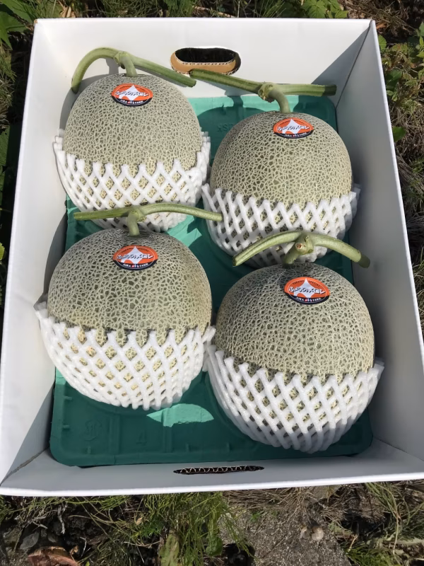 ー 当ファームのメロンは、ストレスをかけないように通常のメロン栽培の株間よりスペースを広く取った畑で育てています。その為、元気な大ぶりのメロンが多く、大箱に4玉しか入らないことが多いのですが5玉入る場合もあります。その日のメロンのサイズによって玉数が変わりますので、ご了承ください。一箱の総重量も、もちろん糖度も美味しさも同じです!