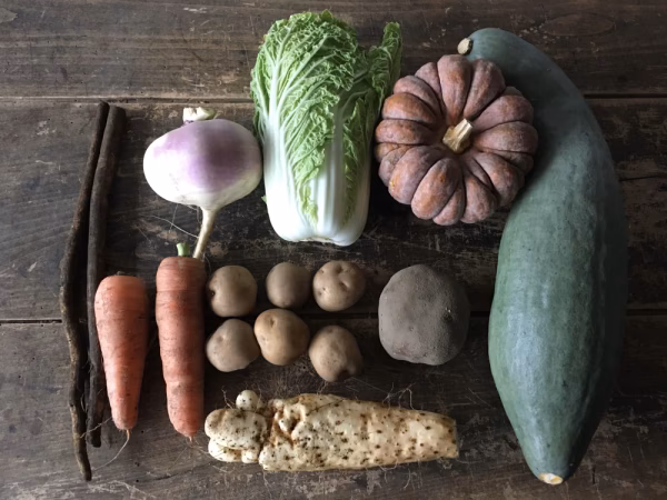 - 画像は冬季野菜セット一例です。 かぼちゃをお入れする場合はどちらか1種類をカットしてお入れします。 他に、ルタバガや葉物野菜が入る場合があります。 冬季は畑が雪で覆われるため収穫がなくなります。生鮮野菜以外に乾燥野菜(切り干し大根・切り干しにんじんなど)が入る場合があります。