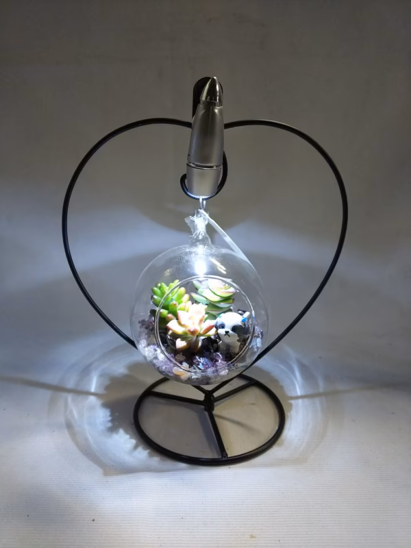 ハート型のイーゼル、丸いガラスに多彩な多肉植物の寄せ植え、ミニスポットライト、説明書