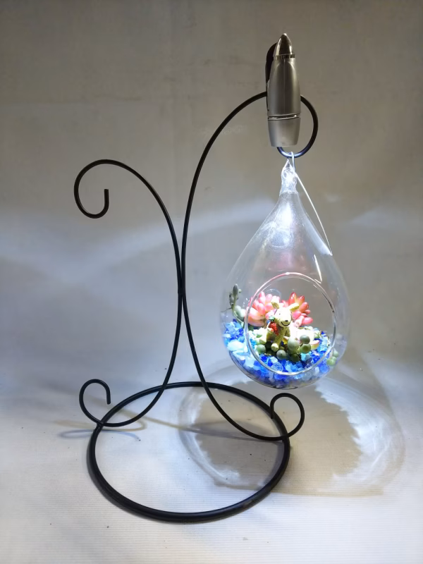 イーゼル、しずく型のガラスに多彩な多肉植物の寄せ植え、ミニスポットライト、説明書