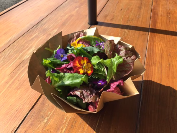 ブーケサラダには、リーフレタス、ルッコラ、わさびな、レッドアマランサス、スイスチャード、カーリーケールなどカラフルな野菜に、エディブルフラワー(ビオラ(青・紫・黄・ラビット)、虹色スミレ)が入っており、2~3人前となっております。