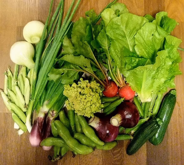 5月〜6月にかけて当菜園で収穫中の「そら豆」「グリーンピース」「ロメインレタス」「イタリアオニオン」「赤たまねぎ」「玉ねぎ」「ズッキーニ」「イタリアカリフラワー(品種名ミケランジェロ)」「ビ━ツ」「ジャガイモ各種(キタアカリ他)」から収穫タイミングに合わせて7〜8品目チョイスした季節の野菜セットです。 当菜園では野菜の栽培期間中に農薬や化学肥料は使用していませんので安心してお召し上がりいただけます。