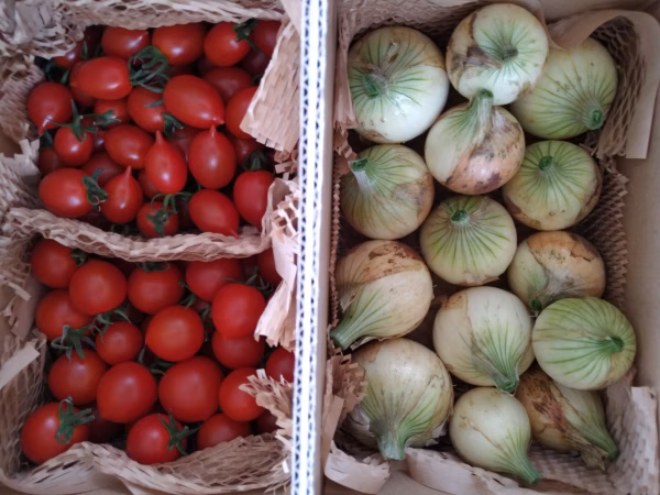 ダルシモール、ほむすびそれぞれ15粒以上 トマト2種で1kg、たまねぎが1kg、合計2kgになります。