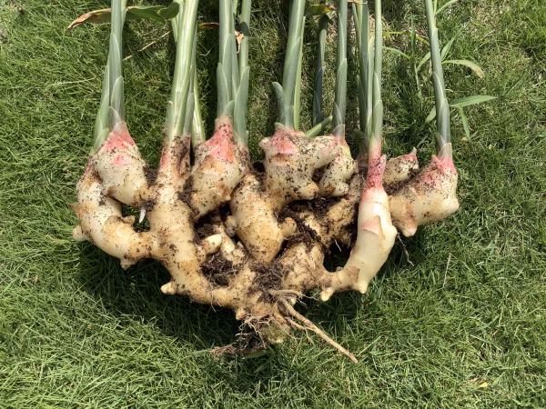 ご存じの方も多いと思いますが、熊本県の生姜生産量は、高知県に次ぎ全国第2位です。そのほとんどが八代市の東陽町を中心にその近隣で生産されています。実は、私も3年ほど東陽町でお世話にあった縁もあり、生産者の方に生姜の種を少し分けていただきました。併せて、育て方のアドバイスもいただきながら、これまでの母の経験も活かし、しょうがの栽培に挑戦しています。本場、東陽町産の生姜には、形も大きさも及びませんが、今年もいい生姜づくりを目指します。収穫時期は、10月から11月ですが、9月末から10月にかけての生姜は、柔らかく、酢生姜づくりには、最高です。1月頃の生姜は、佃煮に向いています。炊きたての白いご飯の友に最高の組み合わせです。