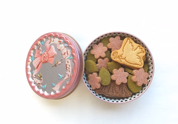 ピンクのお色味が優しく美しいデザインの缶は、手のひらサイズの可愛らしさで贈り物にもおすすめです(綺麗なデザインの缶が見えるよう透明袋へお入れしてゴールドのリボンをかけてのラッピングをして発送いたしますのでそのままお渡しいただけます)