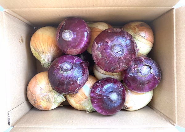 黄玉ねぎ約3.5kg(8〜10玉)と赤玉ねぎ約1.5kg(5球)で、どちらも超大玉(2Lサイズ)の混合詰めになります。
