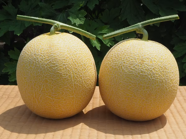 黄いろの果皮に白いネットが入る、華やかな雰囲気のメロンです。果肉は黄緑色をしており、カットすると果皮とのコントラストが爽やかで、見た目にも楽しめる品種です。糖度が高くなり、食味のよいメロンです。