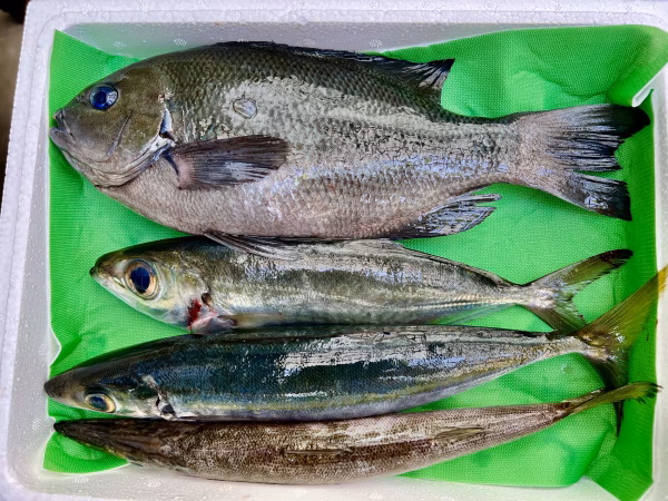こちらは、本日(5/31)に水揚げされた鮮魚セットに入りきらなかった”余りモノ”です。「メジナ」「ムロアジ」「カマス」「メアジ」の4種入りとなります。
