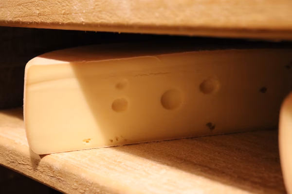 トムとジェリーのアニメでもおなじみの穴あきチーズが出来ました。スイス原産のエメンタールチーズのような甘い香りも少しあって、生食でも加熱してもとても美味しく召し上がれます。毎回できるものではないので数量限定です。