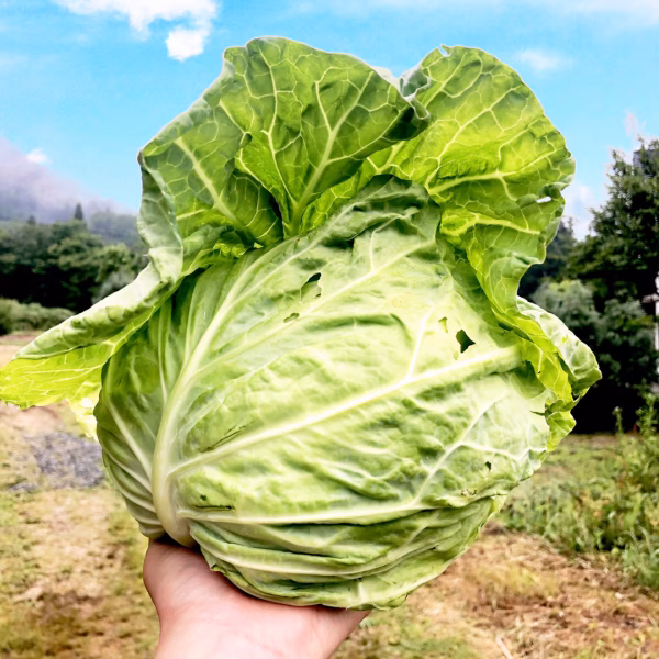 🥬今期のキャベツは、畑の状況により、F1の春波を種から農薬不使用で育て、定植後、ひと握りの米糠を間に添えてみました。