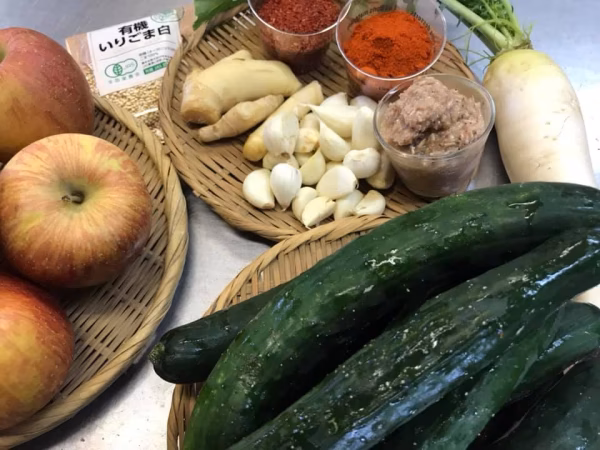 原材料 初夏白菜 りんご ニラ 自然塩 新にんにく 新生姜 無農薬韓国唐辛子 アミの塩辛 糀 味噌 ゴマ