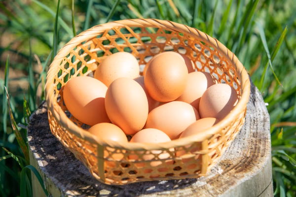 黄身がしっかりと白身の中に納まっていて、弾力があり、盛り上がっています。臭みがなく、あっさりしていますが旨味があり、黄身はもちろん、白身も甘み・旨味が強く感じられます。草をたくさん食べているので、着色料は食べさせていませんが黄身の色は割と濃いめです。冬季は、雪が積もるので放牧はせず鶏舎の中で暮らし、自家栽培のオーガニックトマトや干し野菜を与えますが、青草が無いので黄身の色が少し薄くなります。四季の変化で変わる玉子の味を、お楽しみいただけたらと思います。