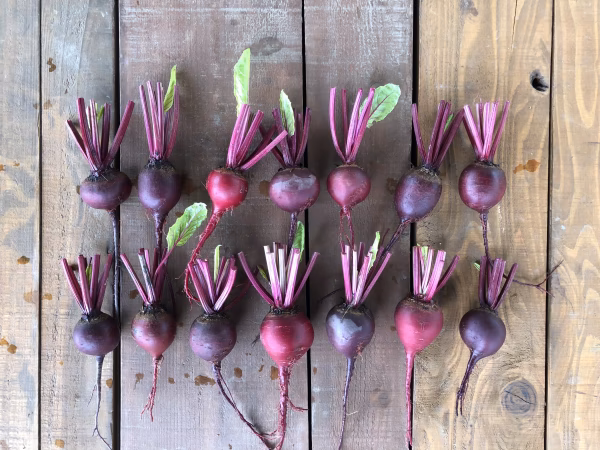 品種名「デトロイト・ダーク・レッド」。世界三大スープのボルシチに欠かせない野菜ですが、注目は優れた栄養価。じっくりホイル焼きが贅沢な食べ方と言われるほど、シンプルな調理でも活きます!肥料で太らせないビーツ本来の味を。