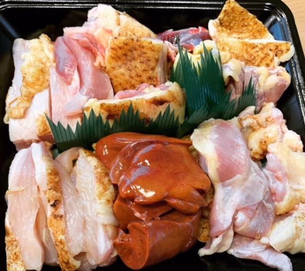 内容⇒大摩桜のモモ肉、ムネ肉、皮付きせせり、皮付ハラミ、ボンジリ、尻皮、レバー、砂ずり、こころ、鶏油