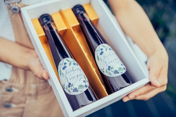 早朝の涼しい時間に、完熟になったブルーベリーを一つ一つ手摘みし、大切に育てたブルーベリーの果実作ったお酢です。