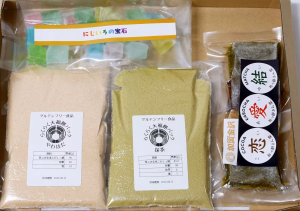 水に溶くだけ簡単もち粉「芽ぶき玄米こがしっ娘」を使った【やわはだ餅】と【にじいろの宝石(琥珀糖)】、【らくらく大福餅パック】のセットです。