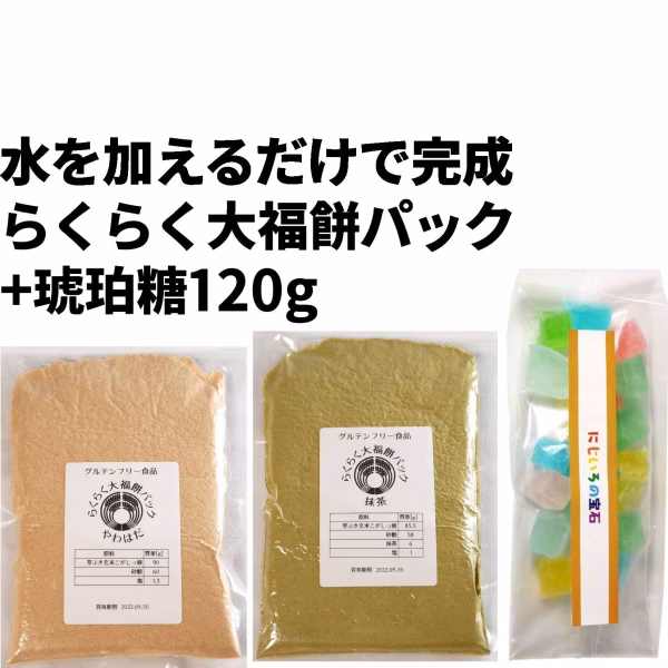 【らくらく大福餅パック】と【にじいろの宝石(琥珀糖)】のセットです。