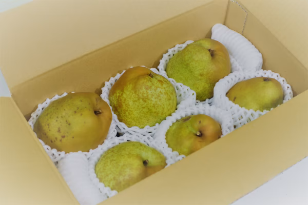 ラ・フランスは収穫直後はまだ食べることができません。追熟と言う行程が必要な果物です。食べごろの2~4日前頃まで当園で追熟した2L品約1.7キロ(6個入り)をお届します。