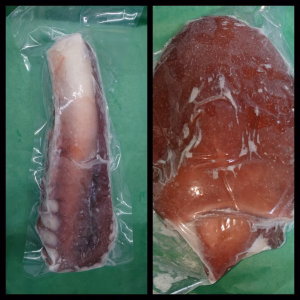 タコ箱漁で水揚げされたタコを即浜茹でし、真空パックをして急速冷凍しています。