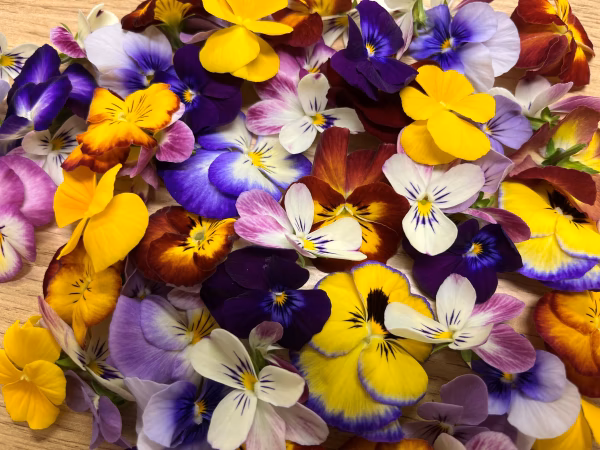 エディブルフラワー(ビオラ(青・紫・黄)、虹色スミレが20輪入っております。見た目が綺麗なだけでなく、カリウム・ビタミン・葉酸をバランスよく含む食材ですので、サラダに添えたり、飲み物に入れたりしてみてはいかがですか。